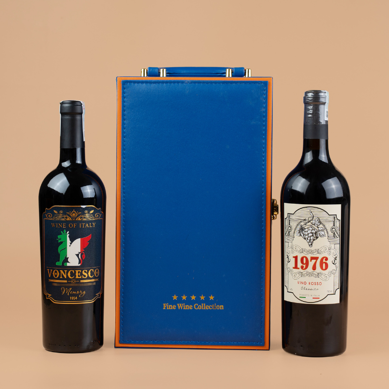 Bên trong lót nhung êm ái, giữ cố định hai chai vang, thể hiện sự chỉn chu và đẳng cấp trong từng chi tiết.